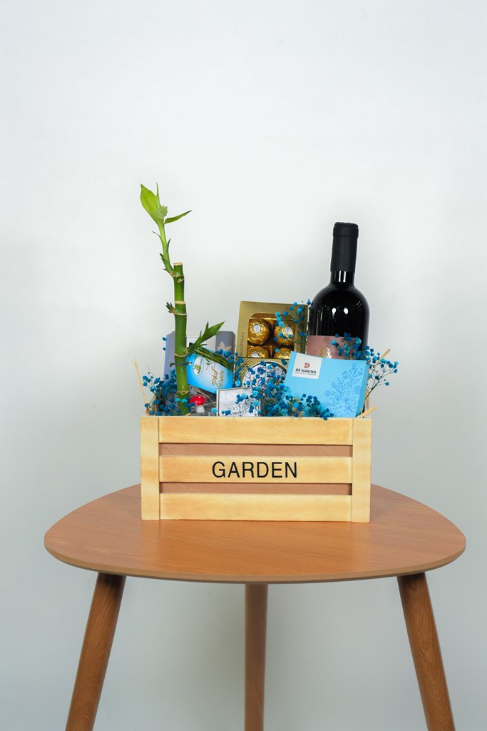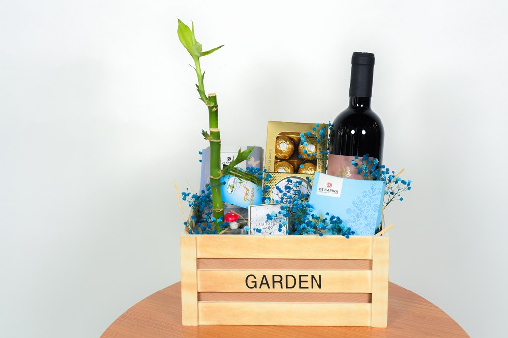 עציץ לאקי במבוק, שוקולד פררו רושה, נר ריחני, בקבוק יין, מארז פרלינים וטבלת שוקולד מבית דה קרינה / ניתן להחליף מוצרים
