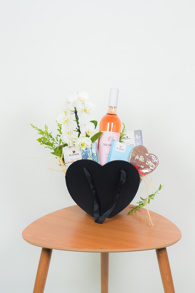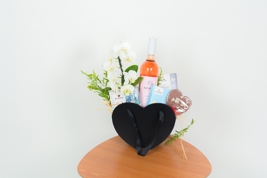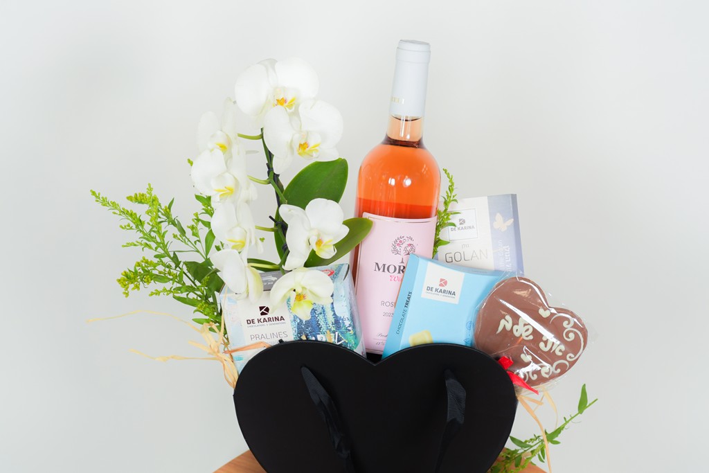 מארז 3 שוקולדים מבית דה קרינה, סחלב, שוקולד לב בהקדשה אישית ובקבוק יין / ניתן להחליף מוצרים
