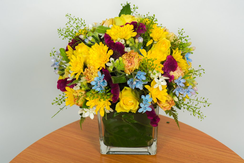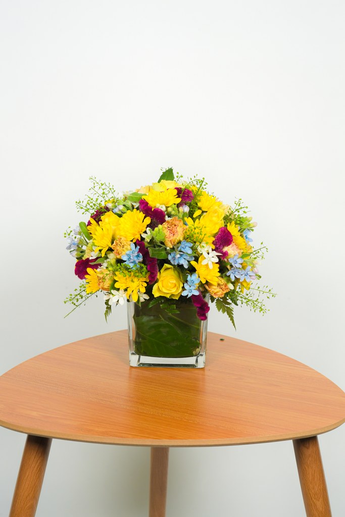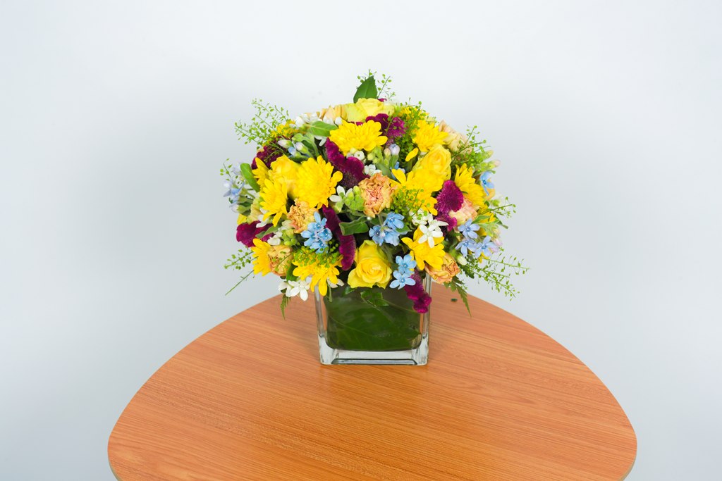 סידור שולחן מרובע – פריחה צהובה עם כלי בקוטר 12